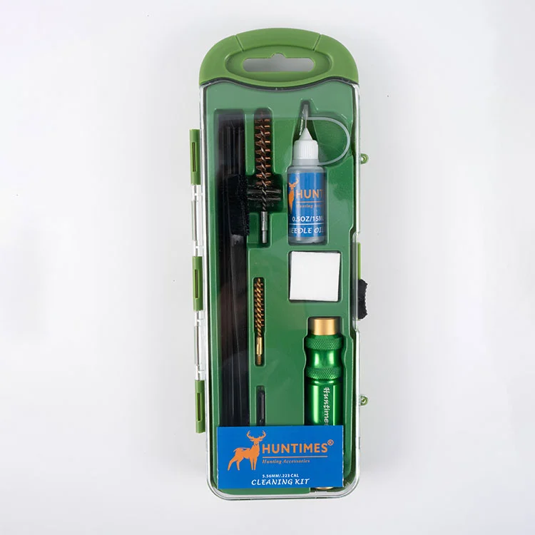 ชุดทำความสะอาดปืนลำกล้องขนาด 5.56 มม. 223 ของ Shanghai Hunting Speed Industry&Trade Co.Ltd มีด้ามจับอะลูมิเนียมที่แข็งแรง และทำจากอะลูมิเนียมอัลลอยด์ที่ทนทาน ประกอบด้วยแท่งทำความสะอาดเหล็กสี่อัน แปรงรูปดาวสำหรับกระสุน 5.56 มม. แปรงห้องสำหรับลำกล้อง .223 ตัวดึงแพทช์สำหรับลำกล้อง .223 และขวดน้ำมันเปล่าขนาด 15 มล. อุปกรณ์เสริมยังมาพร้อมกับแปรงไนลอนสำหรับทำความสะอาด แผ่นทำความสะอาด 25 ชิ้น และด้ามจับอะลูมิเนียมหรูหรา ชุดนี้เหมาะสำหรับความต้องการในการทำความสะอาดอุปกรณ์เสริมการล่าสัตว์ปืน AR ของคุณ